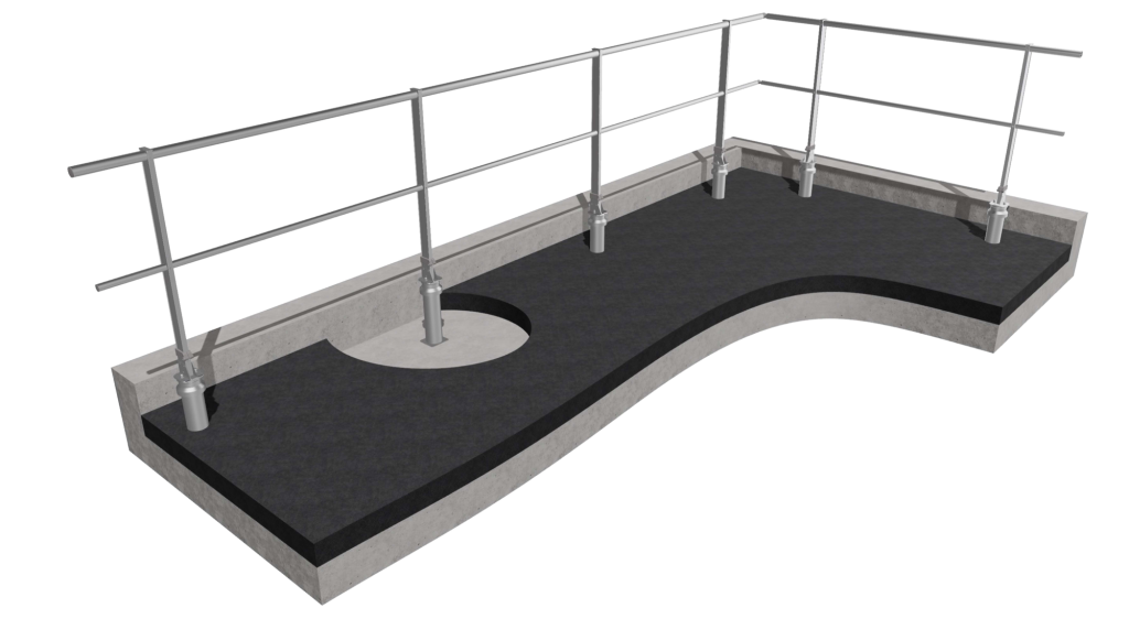 La barandilla para losa impermeabilizada M-SAFE se fija en una losa islada a través del sistema de impermeabilización mediante su base tipo D. Disponible en tres alturas estándar (300, 400 y 500 mm), cumplen con el DIU 43.1, la normativa de impermeabilización de terrazas.