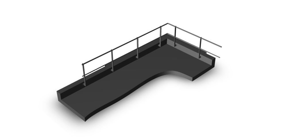La inclinación de la barandilla está asegurada por la base con fijación a la pared siendo entregada en versión recta o inclinada a 25º. Una base para dos versiones: la base con fijación a la pared inclinada se utiliza para la versión con y sin desplazamiento.